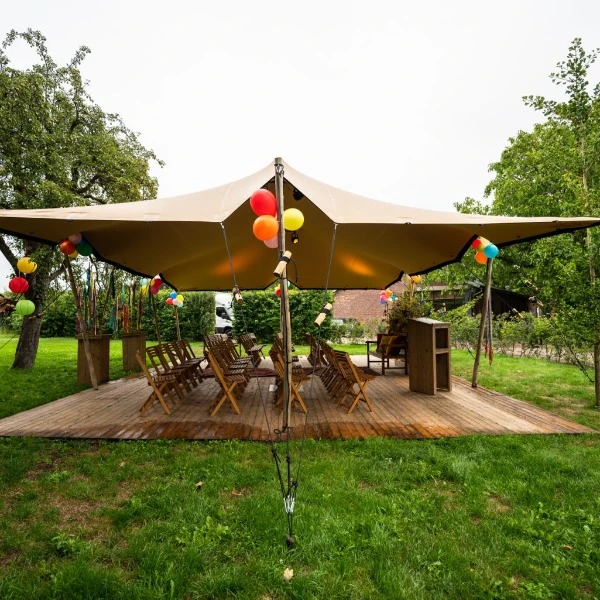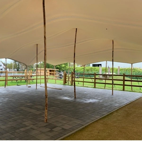 met het huren van een stretchtent krijgt uw evenement een unieke en luxe uitstraling. Door de compacte vorm van de tent is het overal inzetbaar. doordat de tent deze luxe uitstraling geeft wordt het vaak ingezet voor seremonie's, bruiloften, verjaardagen of evenementen. de stretchtent wordt geleverd met mooie houten palen van eucalyptushout. Dit om ons materiaal zo goed mogelijk te kunnen verduurzamen. de stretchtenten van Partyverhuur Dodewaard worden geleverd in zandkleur aan de buitenkant en creme aan de binnenkant.