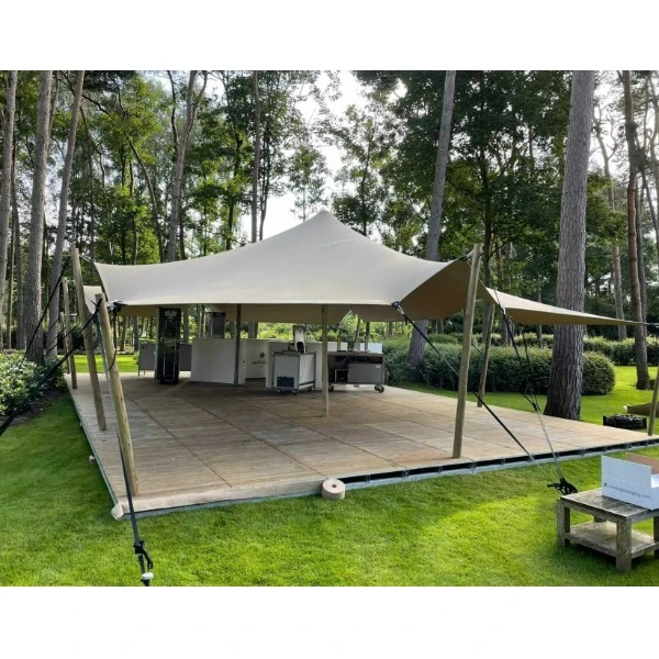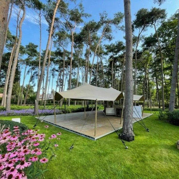 met het huren van een stretchtent krijgt uw evenement een unieke en luxe uitstraling. Door de compacte vorm van de tent is het overal inzetbaar. doordat de tent deze luxe uitstraling geeft wordt het vaak ingezet voor seremonie's, bruiloften, verjaardagen of evenementen. de stretchtent wordt geleverd met mooie houten palen van eucalyptushout. dit om ons materiaal zo goed mogelijk te kunnen verduurzamen. de stretchtenten van Partyverhuur Dodewaard worden geleverd in zandkleur aan de buitenkant en creme aan de binnenkant.